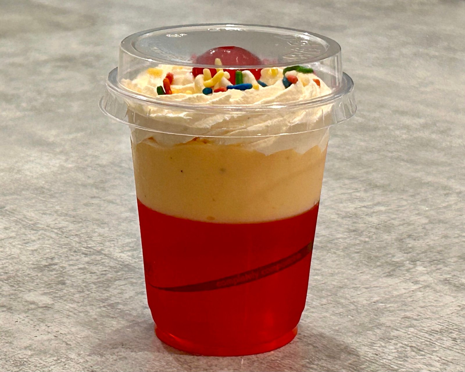 Berry jelly, our vanilla bean custard, fresh whipped cream, finished with GETBAKED sprinkles & a glacé cherry [V] Packaged in clear cups with lids made by vegware which are plant based and completely compostable.