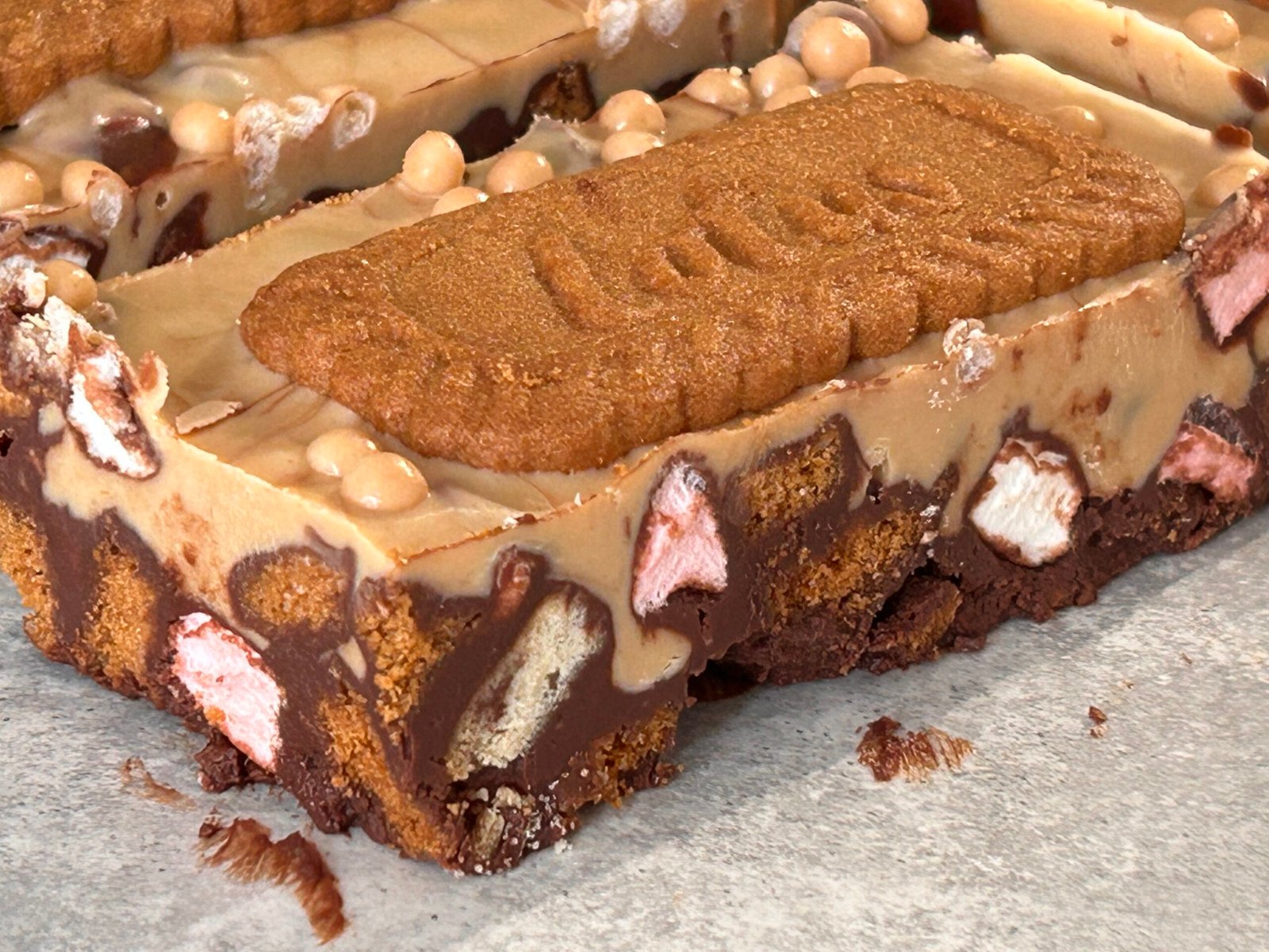 Belgian semi dark chocolate filled with chunks of rich tea biscuits, marshmallows, and Lotus Biscoff biscuits, topped with Lotus Biscoff white chocolate topping finished off with caramel chocolate rice cereal balls and Lotus Biscoff biscuits.