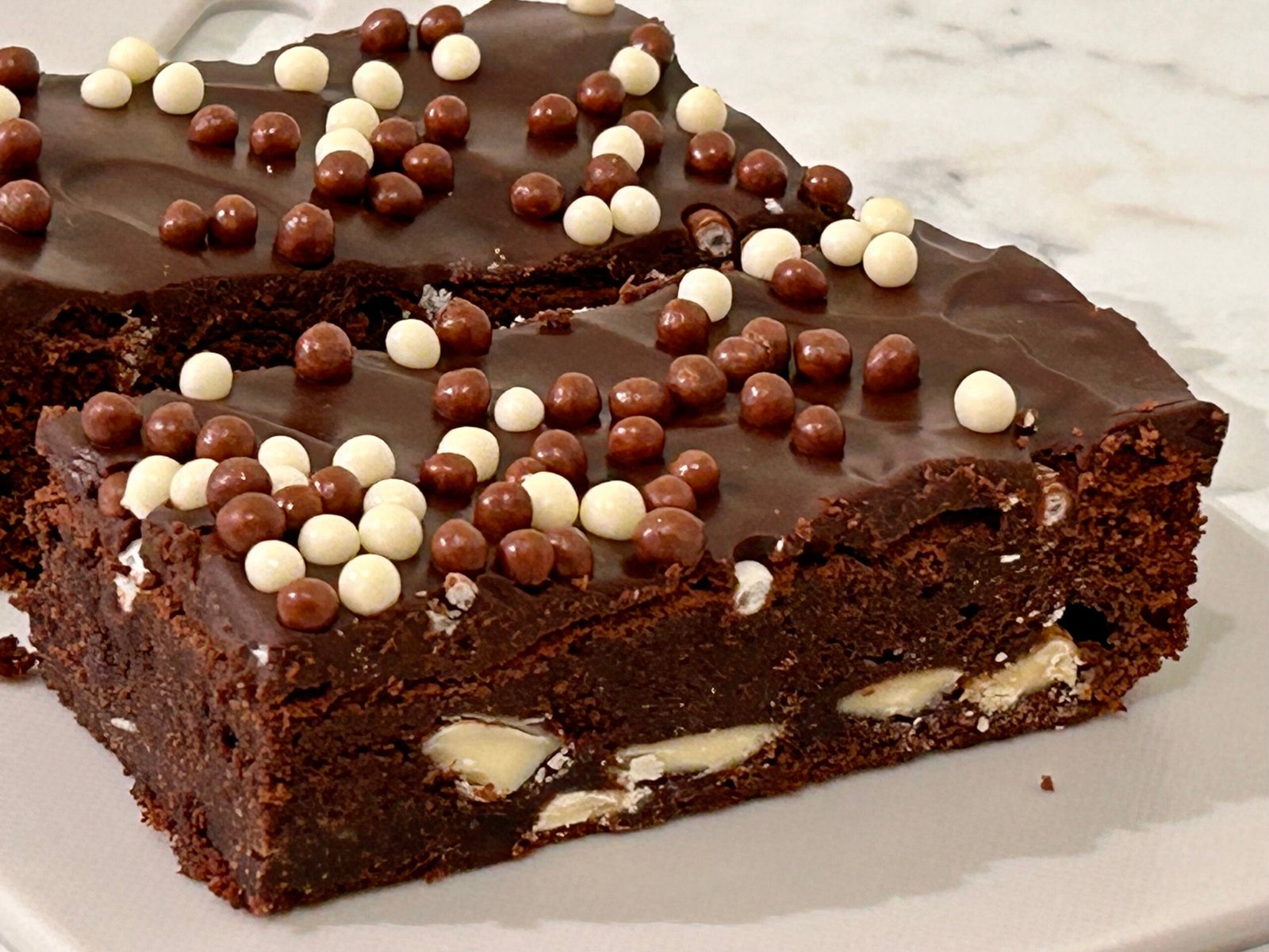 Our signature brownie recipe filled with white chocolate chunks, topped with Belgian chocolate ganache & finished with white & milk crisped rice balls.